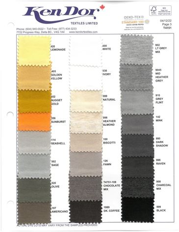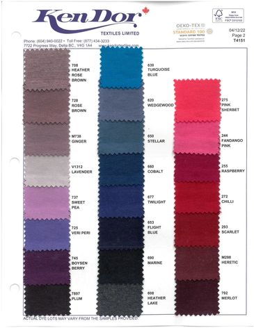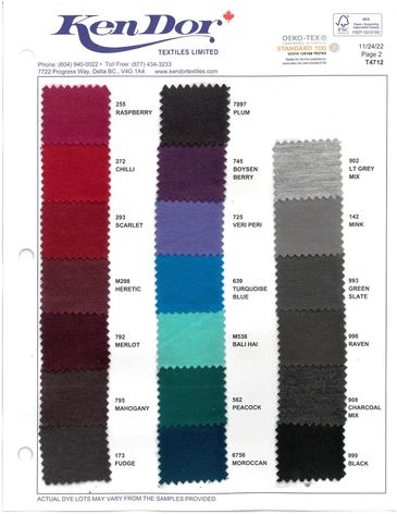 A just right 300 GSM.  Ultra soft back.  As you can see, amazing color selection.  Also matching rib knit for trim.