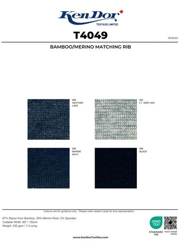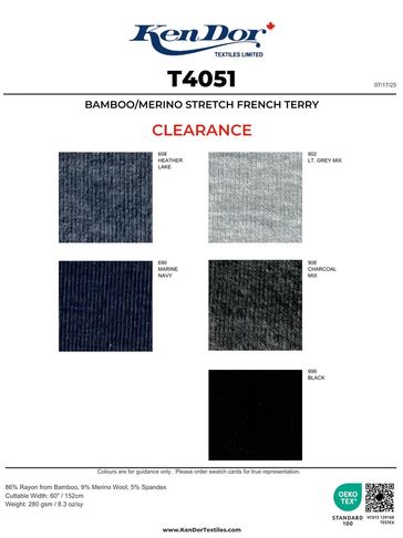 300 GSM   60"   86% Bamboo/9% Merino Wool/5% Spandex.  Heather Lake, Marine Navy, Grey Mix, Charcoal Mix, Black    Subject to Prior Sale.