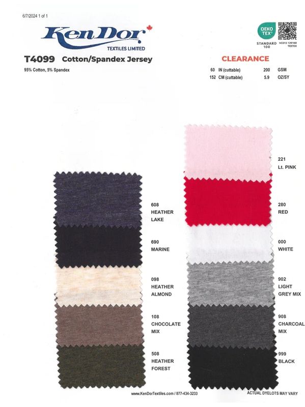 T4099 Cotton/Spandex Jersey.  60" wide.  200 GSM.  No Black or White.