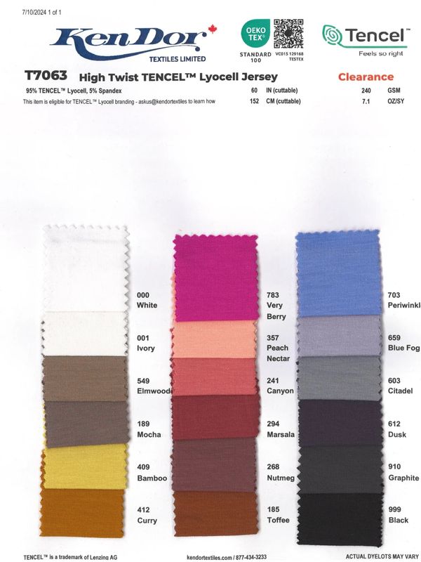 KenDor's Perfect Tencel Jersey.  240 GSM.  60" wide.  An unbelievable price for fine knit fabric.  $6.06 per yd.  Not all colors available but there are still 11 active colors.